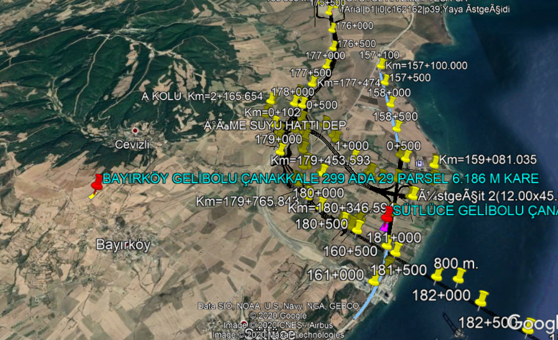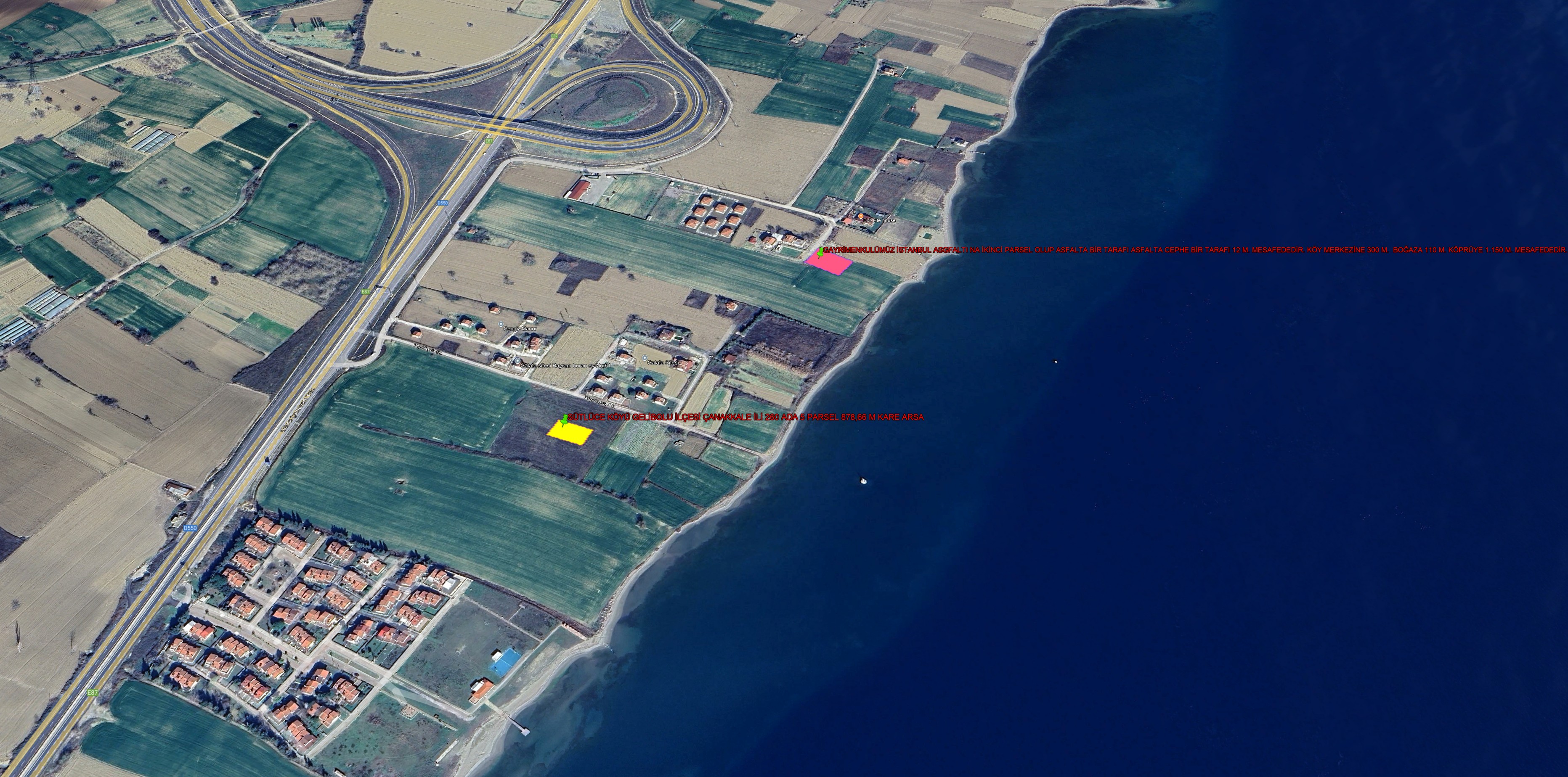 LAPSEKİ SULUCA KÖYÜNDE OTOBAN TESİSLERE CEPHE FULL B OĞAZ VE KÖPRÜ MANZARALI 2.243 M KARE TARLATARLA
